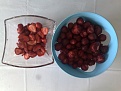 Zwischen 16:30 und 17:10 weiche ich etwas von der instinktiven Rohkost ab: Ich esse etwas getrocknete Durian und ebenso wenig getrocknete junge Kokosnuss - beides Reste aus einem Trockenfrüchte-Testset von Orkos. Danach gibt es - meine Frau lädt ein - einen Teller mit einem Rohkost-Dessert, bestehend aus geriebenem Apfel, Granatapfelkernen, Kakaonibs und einer Sauce aus gemahlenen Cashewkernen, Vanillepulver und Agavendicksaft; sowie eine Kostprobe Erdbeereis, bestehend aus gefrorenem, mit Rohrohr-Puderzucker nachgesüßtem Erdbeermuß - und abschließend noch ein paar von unserem Jüngerem im Garten gepflückte Erdbeeren (überwiegend die kleinen Walderdbeeren) - die sind einfach viel intensiver als die gekauften. Bei den gekauften könnte man auch wieder argwöhnen, dass es sich um Züchtungen handelt, die den Fruchtzuckeranteil und den Wasseranteil erhöhen, und mit denen der Instinkt (und auch die Verdauung) nur noch bedingt zurecht kommt ...