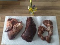 ich hole frisches Fleisch und Innereien vom Fleckvieh (links: Bauch, Entrecote, Lende und Rouladen; rechts: Herz, Leber, Niere):
